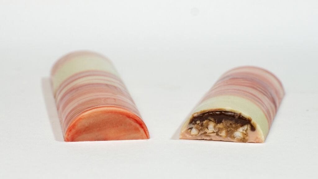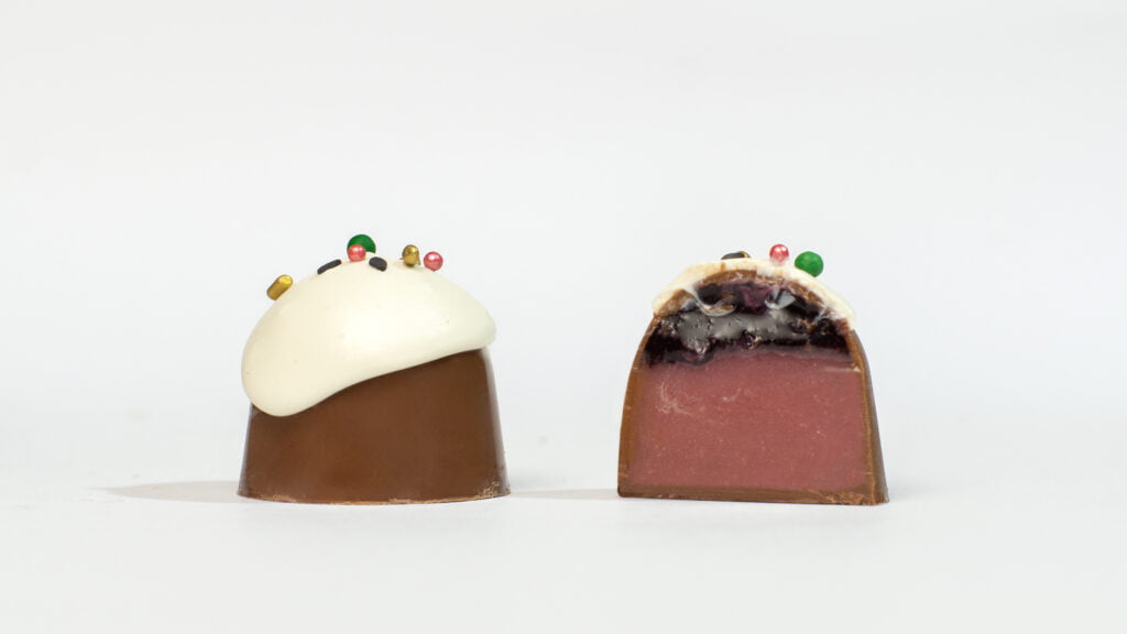 TÉCNICA DE DISEÑO 4: «PANETTONE»: Técnica de decoración externa de bombones con manga pastelera. Dosificación de dos capas de relleno; ganache de frutos del bosque, pasta de fruta de frutos del bosque.